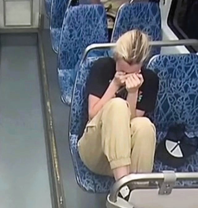 Once Iryna realized she had been stabbed, she put her head in her hands, knowing she would bleed out and die alone. Within ten seconds of this picture, she keeled over to her left, our right as viewers, and died. It was almost a full two minutes before anyone came over to help from other cars on the train.